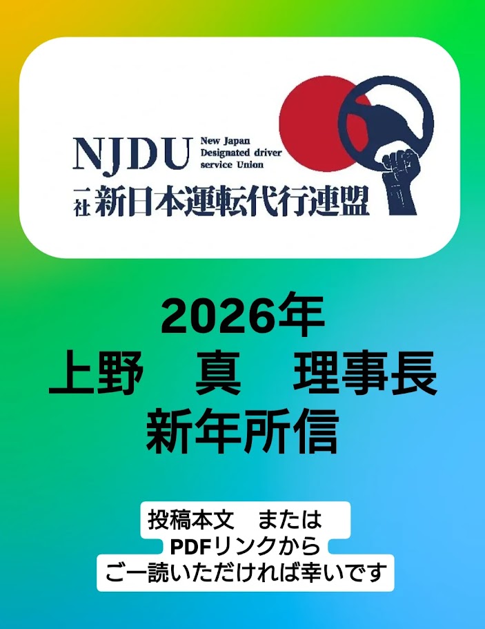 新年あけましておめでとうございます。平素より、一般社団法人新日本運転代行連盟の活動に格別のご理解とご協力を賜り、心より御礼申し上げます。